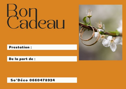 Besoin d'offrir un cadeau de mariage ,d'anniversaire, de Noël, ou simplement le plaisir d'offrir? Rien de plus original qu'une carte cadeau So'Déco à personnaliser selon votre budget, pour des conseils d'aménagement , le relooking d'une pièce, la décoration d'une chambre bébé, etc...